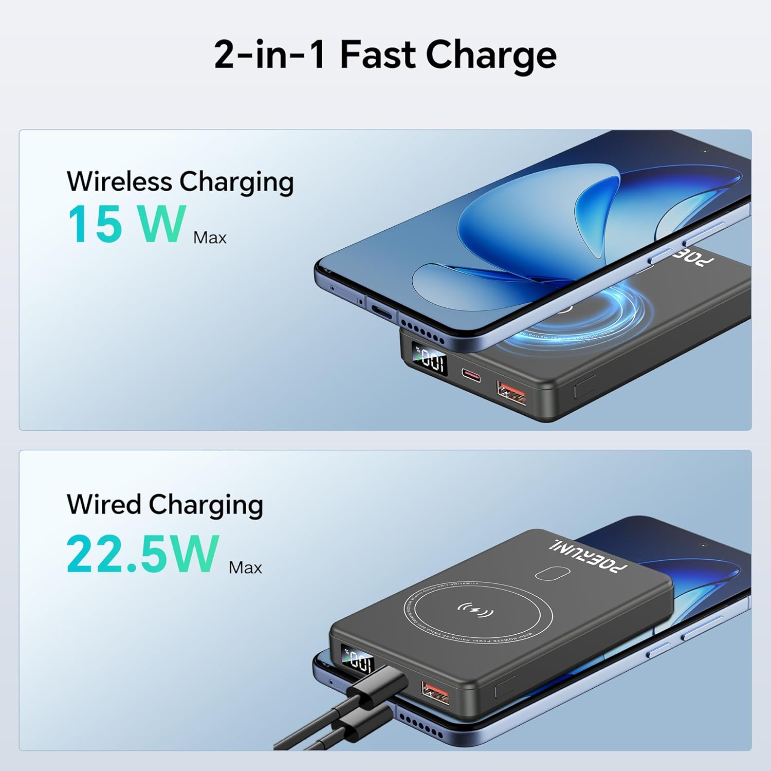 Multifunctional Portable Charger: Magnetic wireless charging for apple devices. Standard Qi wireless charging for AirPods, Android phones, or other Qi-enabled devices;Dual Wired Outputs with a USB-C port (15W PD Fast Charge) and a USB port. Charge up to three devices simultaneously, making it the ultimate travel companion for you and your friends.