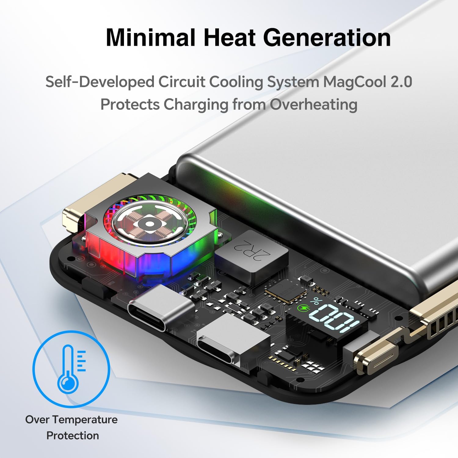 【Controllable Cooling Magnetic Power bank】In order to solve the problem of charging heat for phone with magnetic power bank, our team developed a new concept product - intelligent cooling magnetic portable charger.Innovative air convection design and high-speed fan effectively dissipate heat during operation. The maximum speed of the fan can reach 10,000 revolutions per minute, and the fan will adjust itself according to the temperature of your phone.the noise levels remain between 20-25 dB.If you do not need to start the fan, long press the left switch, the fan and RGB are off, and the powerbank can still power your phone.