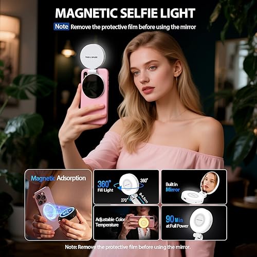 Portable Design & Built-in Makeup Mirror: This mini phone fill light measures just 2.99" in diameter when folded and weighs 3.81oz, making it easy to slip into your pocket and carry wherever you need. In addition to serving as a selfie ring light, it doubles as a phone stand for your desk and a makeup mirror. Note: Peel off the protective film before using the mirror.
