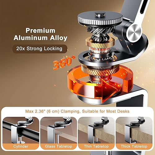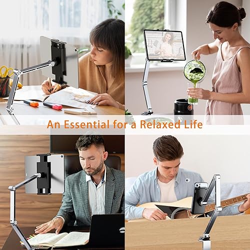 【FULLY ADJUSTABLE DESIGN】Featuring a 3-section long arm and 360° rotating base, this tablet holder mount offers greater flexibility and longer reach. It bends and rotates for the perfect viewing angle, whether you're standing, sitting, or lying down. Ideal for watching movies, gaming, reading, or cooking.