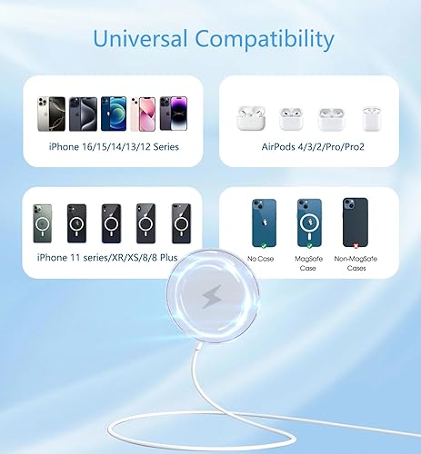 [Universal Compatibility]This magnetic charger for iPhone supports fast magnetic charging speeds of up to 15W.iPhone wireless charger compatible with iPhone 16 Pro Max/16 Pro/16 Plus/16/15 Pro Max/15 Pro/15 Plus/15/14 Pro Max/14 Pro/14 Plus/14/13 Pro Max/13 Pro/13/13 Mini/12 Pro Max/12 Pro/12 Mini/12 and AriPods 4/3/2/Pro/Pro2.This iPhone wireless charger is supported with no case or Mag-safe case,a normal case is not supported