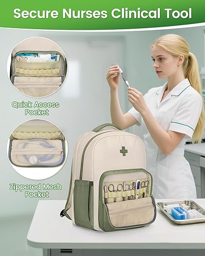 Quick Access & Organized Front Pockets: The front zip pocket and multiple open slots are perfect for storing notebooks, pens, and keeping essentials within easy reach. A front D-ring lets you hang small accessories such as keys or ID badges. The large front compartment includes elastic bands and mesh pockets to keep medical items organized and secure, whether you are at school, work, or on home visits. This thoughtful design helps maintain organization throughout the nursing backpack for nurses