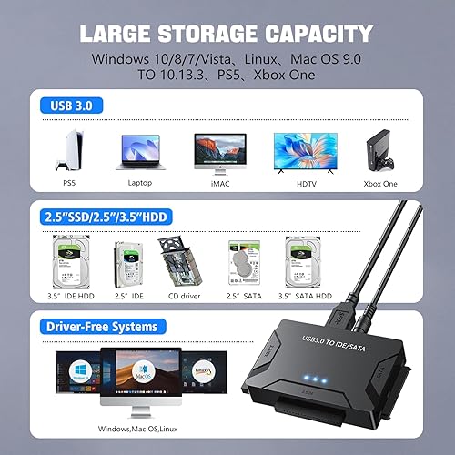Cross-Platform Compatibility Operating Systems: Windows 10/8/7/Vista, Linux, Mac OS 9.0–10.13.3 Devices: Works with PS4, Xbox One, and major HDD/SSD brands (WD, Seagate, Toshiba, Samsung), plus DVD-ROM/CD-ROM/CD-RW drives Plug-and-play setup (no drivers required for most systems; legacy OS may need manual installation)