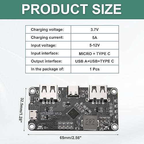 Step Up Power Bank Board;Charging voltage:3.7V;Charging current:5A;Input voltage:5-12V;Input interface: MICRO + TYPE C;Output interface: USB A+USB+TYPE C;Total Size:65x32.5mm/2.56x1.28 inch (L*W);In the package of: 1 pcs x Dual Boost Charging Module