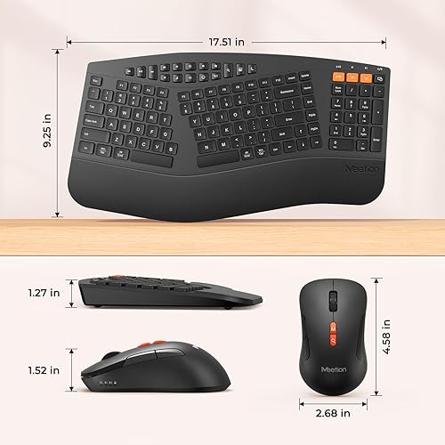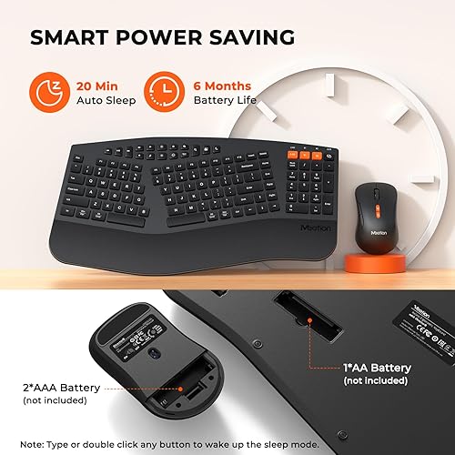 【2025 UPGRADE ERGONOMIC】The MEETION ergonomic wireless keyboard utilizes a split key frame design that follows the natural stretching posture of the wrists and arms, avoiding overstretching or twisting. The angled keyboard design reduces stress on the wrist and forearm muscles, allowing you to type with less strain, even after hours of continuous typing. The keyboard requires two AAA batteries (not included) and the mouse requires one AA battery (not included).