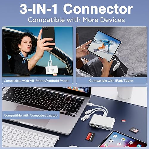 4-in-1 Multi-Card Reader & Triple-Port Compatibility: This memory stick pro duo adapter supports SD, TF (Micro SD), MS (Memory Stick), and XD-Picture cards, eliminating the need for multiple readers. With Lightning, USB-C, and USB-A connectors, it works seamlessly with iPhone 16/15/14 series, iPad, Android phones, Mac, PC, and more—no extra apps or drivers required.
