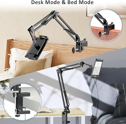 [ Durable & Robust ] Different from other plastic gooseneck holder, ours is made of metal which is much more durable and sturdy. The clamp can max clip 2.5in/6.2cm thickness which can mount to most headboard, desk or table bedside; In addition, the base has 2 holes for the arm, then can use it for both desk mode and bed mode
