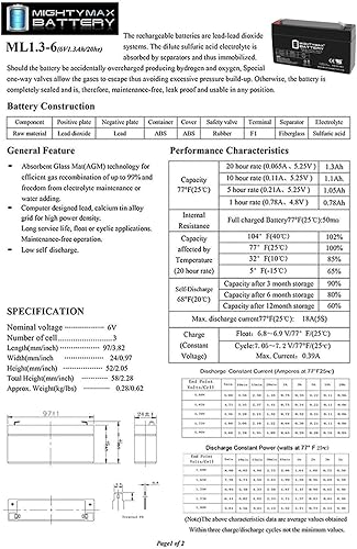 • ML1.3-6 SLA is a 6V 1.3AH Sealed Lead Acid (SLA) rechargeable maintenance free battery, Pack of 6 - UL Certified