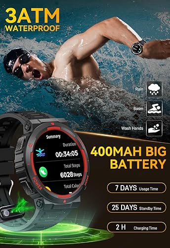 3ATM Waterproof & 400mAh Battery - With a 3ATM waterproof rating, Dealark rugged smartwatch can be worn while swimming or outdoors. The iOS Android smartwatch is equipped with a 400mAh battery that supports magnetic charging, offering up to 7 days of normal use and 25 days of standby time. Say goodbye to worries about running out of battery outdoors.