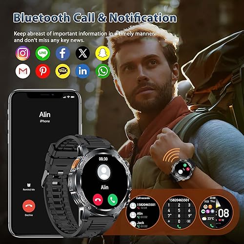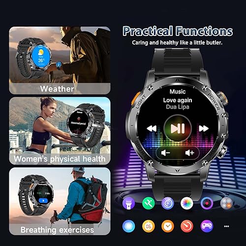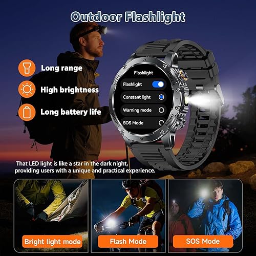 【Military Watch with LED & Larger 1.7'' HD Screen】- Military smart watches for men combines fashion and functionality, featuring a 1.7-inch high-definition large screen that can be adapted to both daily use and sports scenarios. That LED light is like a star in the dark night, providing users with a unique and practical experience. When in a pitch-dark outdoor environment, simply press smart watch android compatible gently and the bright LED light will turn on, illuminating the way forward.