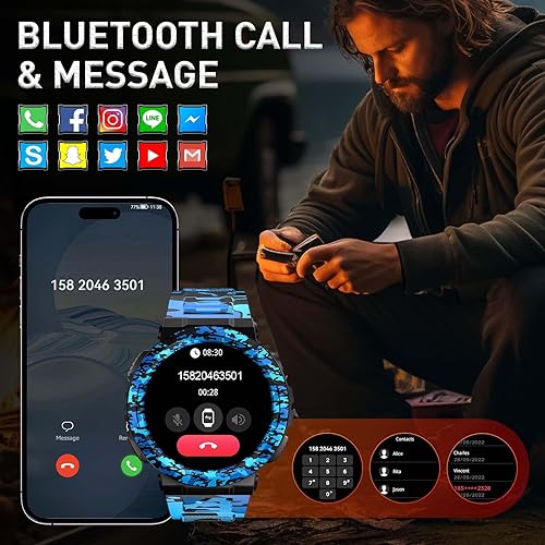 [Military Smartwatch with LED Flashlight]: Men's military smart watch is composed of special metal material and silicone strap, which is comfortable and easy to wear, the case is sturdy and durable, able to withstand wind, sand, shock, abrasion, etc., suitable for outdoor activities. Tactical smart watches for men are built with a powerful LED flashlight, suitable for use in dark or low-light environments, such as walking at night, camping, etc., providing safety for your travelling.