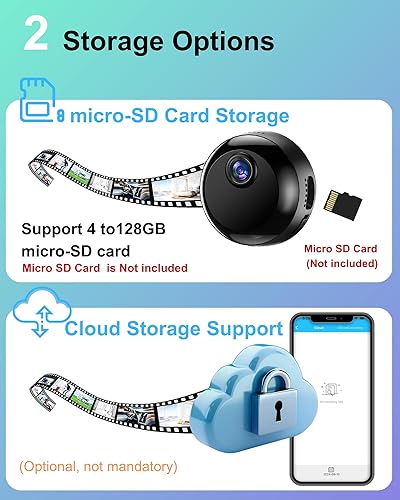 【2 Storage Options】: This wifi camera supports record and save videos to micro-SD card or Cloud storage. It supports 4-128GB micro-SD card(Not included). Cloud storage is optional for safe backup, not mandatory.