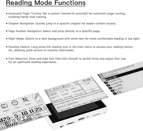 【High Customizability】: The product provides hardware schematics. If you are a programming enthusiast, you can write your own custom firmware, offering great flexibility and fun. The device can scan font files (.bin) to switch between different font styles and adjust font size, allowing you to customize the display for the most comfortable reading experience.