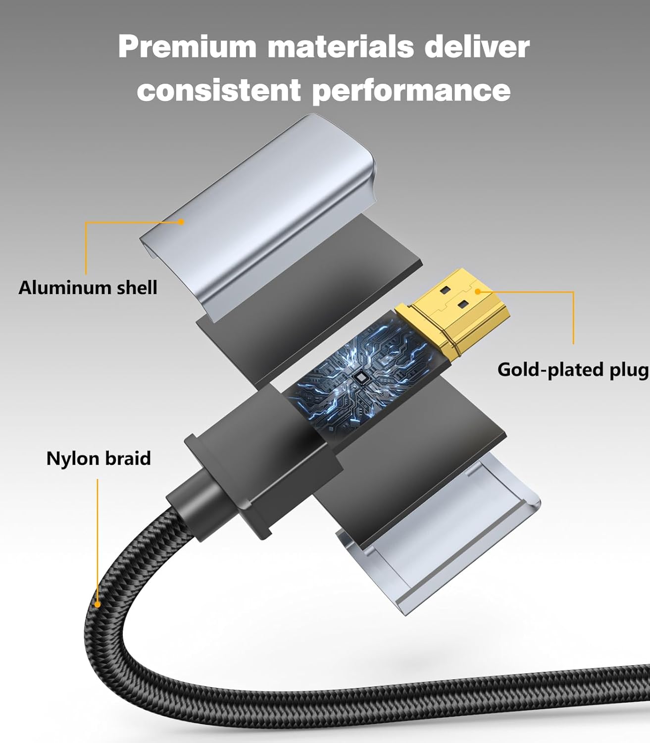 【Stable and Durable Premium Materials】Features gold-plated connectors for oxidation resistance, an aluminum alloy shell for interference protection, and a braided cable body for tear resistance. Combined with triple shielding and tinned copper cores, it ensures stable signal transmission and extends service life.