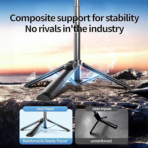 【Wireless Detachable Remote】 The selfie stick tripod with remote is very easy to use. phone tripod with the most advanced chips, fully compatible with i-phone and android devices, easy to pair. The remote is removable from the stick, allowing you to take pictures by yourself or group photos by taking off the remote control for more photo flexibility. The control distance can reach up to 33 feet.