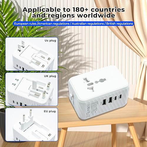 Travel Anywhere: One Plug, 180+ Countries Includes 4 plug types, US, EU, UK, and AU standards.