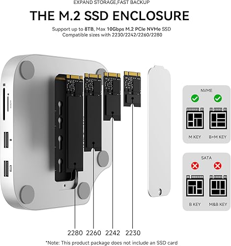 【Unleash the Potential of Your Mac Mini with Ultra-Fast Storage Expansion】: Minisopuru mac mini m4 dock with an SSD enclosure that supports up to 8TB of M.2 NVME SSDs and is compatible with most SSD form factors (2230/2242/2260/2280). The Mac mini M4 hub easily provides massive storage expansion and fast backups. Designed for creators and professionals, it keeps your creative assets readily available and streamlines your workflow. (Please note: This package does not include an SSD card)