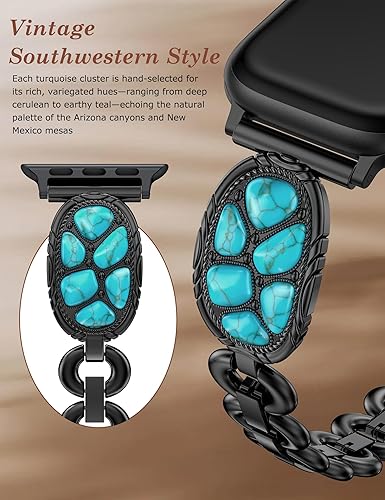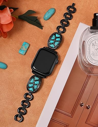 Minyee Turquoise Stone Bracelet Compatible with Apple Watch Band Women 42/46/38/40/41/44/45/49mm, Western Boho Cowboy Retro Adjustable Metal Strap for iWatch Series 11 10 9 8 7 6 5 4 Ultra/SE 3 2 1(Black/Turquoise,38/40/41/42mm(Series 11/10))