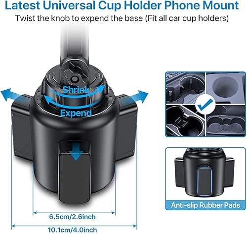 Upgraded Wider Expandable Base: The upgraded adjustable base can be extended from 2.6 to 4.0 inches to fit all car cup holders.Meanwhile, with the soft anti-skid silicone pads and durable & highly material, the cup phone holder will be securely locked in your cup holder. Never fall off and broke. Protect your devices from damage.