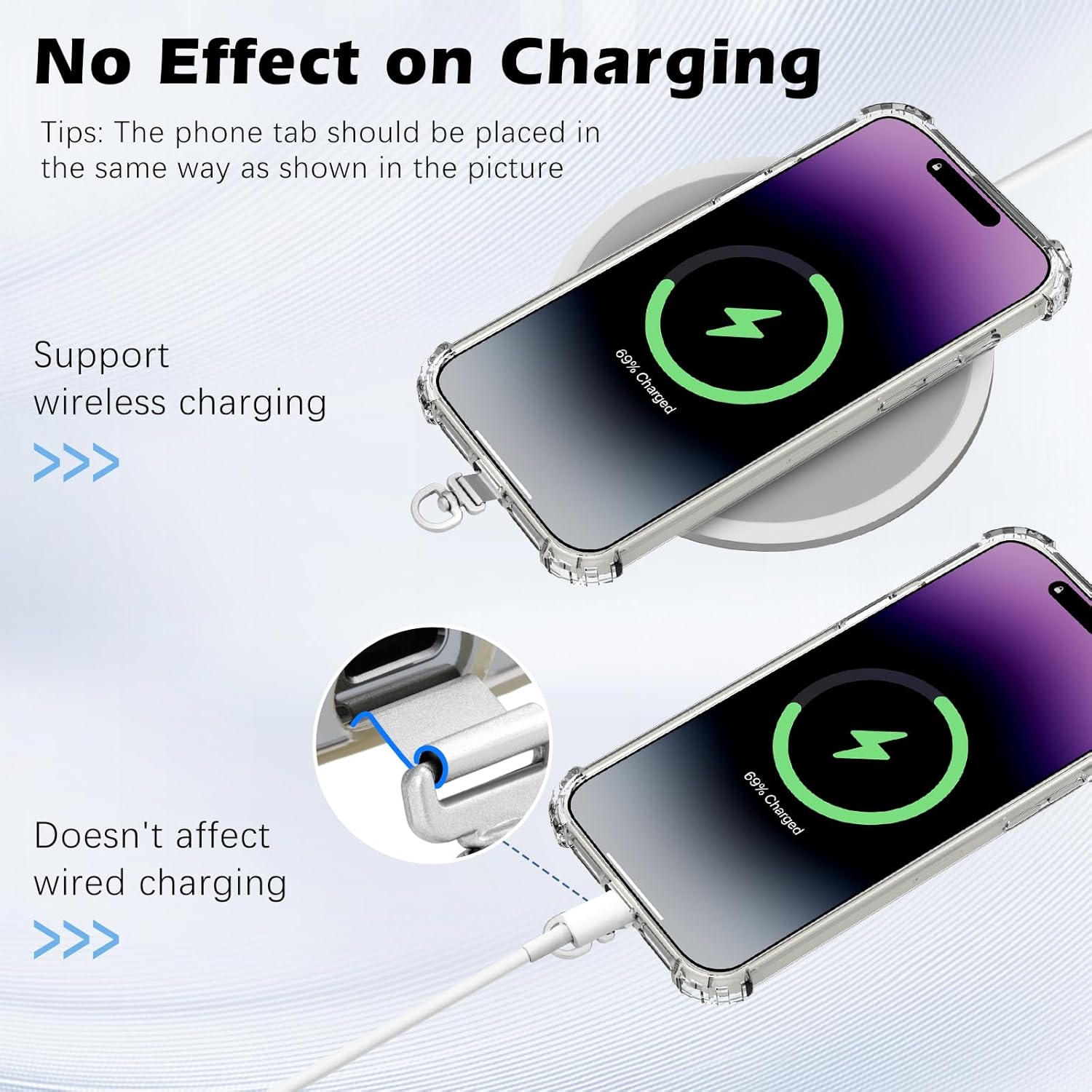 Ultra-thin Design: The thickness of the phone lanyard tab is 0.013 in/0.35 mm, which does not obstruct the charging port, so you can charge your phone without removing the phone case. The metal phone tether tab dimensions (L × H): 0.78 in/2 cm × 1.85 in/4.7 cm.