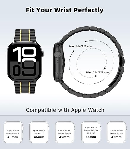 Comment on "MoKo Metal Bands for Men Women Compatible with Apple Watch Ultra 3/2/1 49mm,S11/S10 46mm,9/8/7 45mm,SE3/SE2/SE/6/5/4 44mm,3/2/1 42mm,Adjustable Stainless Steel Strap Business Replacement Wristband(Black/Gold)"