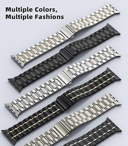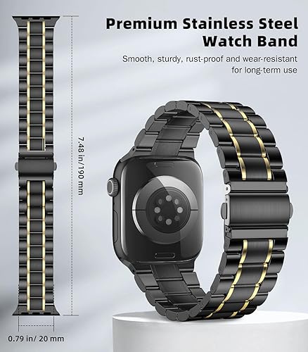 MoKo Metal Bands for Men Women Compatible with Apple Watch Ultra 3/2/1 49mm,S11/S10 46mm,9/8/7 45mm,SE3/SE2/SE/6/5/4 44mm,3/2/1 42mm,Adjustable Stainless Steel Strap Business Replacement Wristband(Black/Gold)