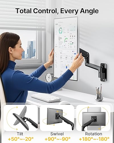 【Durable & Reliable】Computer monitor wall mount is made of high quality aluminum and the internal gas spring has been rigorously fatigue tested over 20,000 times to ensure a high degree of stability and durability. To ensure maximum safety and stability, we recommend mounting the vesa wall mount to a wood stud, solid concrete, or a brick wall. (Note: Do not mount on drywall alone!)