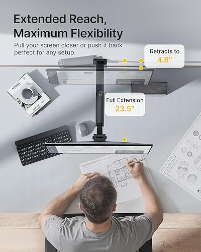 【Free Up Your Desktop Space】Computer wall mount allows you to say goodbye to clutter and save more desktop space. When not in use, the adjustable arm pulls in closer to the wall to just 4.8”. In addition, ultrawide monitor mount comes with a cable management feature to keep your cables neatly organized.