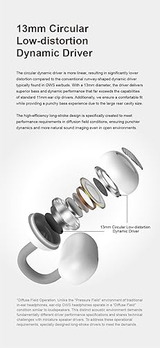【13mm Circular Low-distortion Dynamic Driver】The circular dynamic driver is more linear, resulting in significantly lower distortion compared to the conventional runway-shaped dynamic driver typically found in OWS earbuds. With a 13mm diameter, the driver delivers superior bass and dynamic performance that far exceeds the capabilities of standard 11mm ear clip drivers. Additionally, we ensure a comfortable fit while providing a punchy bass experience due to the large rear cavity size.