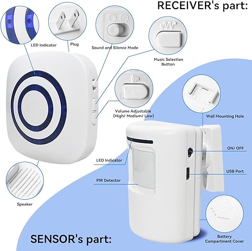 【WIDE-RANGE PROTECTION】 This motion sensor alarm indoor is designed to detect people, vehicles, or animals entering the monitored area. When triggered, it sends a signal to the receiver, which then sounds an alarm and flashes an indicator light. This alerts the homeowner to the presence of an intruder or visitor, helping to monitor and safeguard your property. It’s versatile and can be used in various locations, such as driveways, front doors, garages, shop entrances, backyards, or mailboxes.