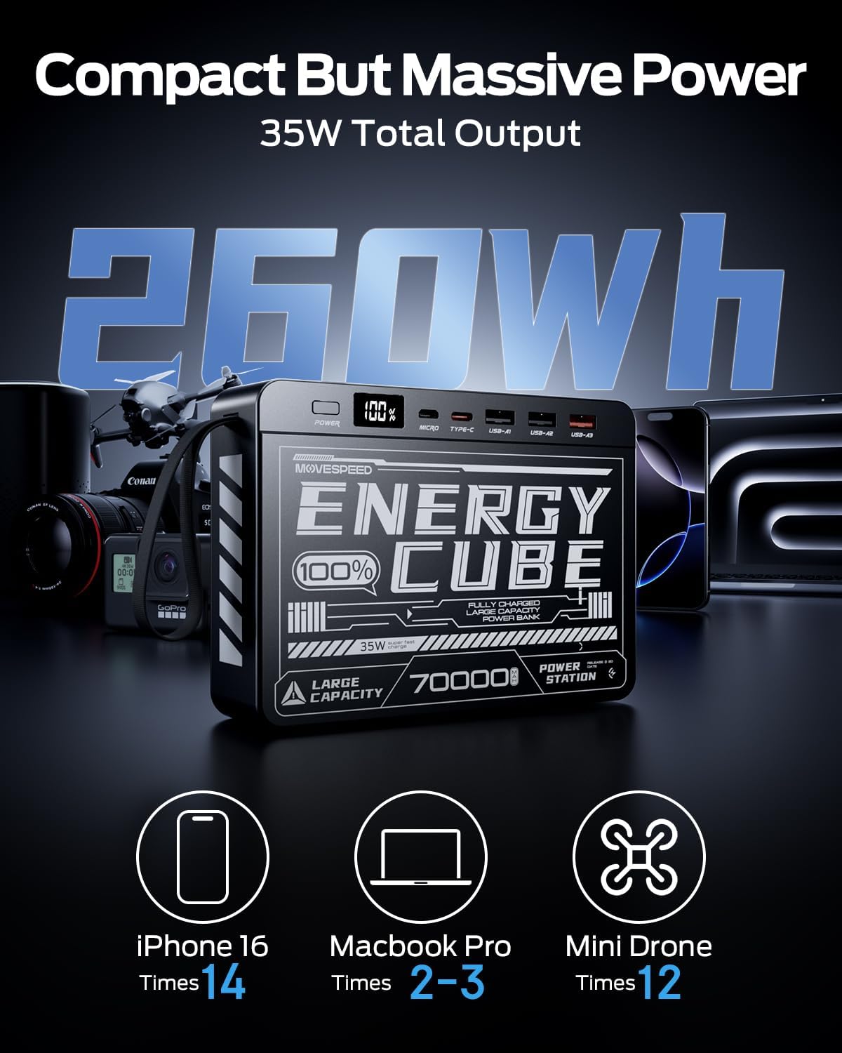 MOVE SPEED Portable Power Station 70,000mAh 260Wh Power Bank for Camping Essentials, 145W Small Generator Laptop Portable Charger, USB C Battery Pack with Flash Light, Home Backup Outdoor Emergency(70000mAh 35w)
