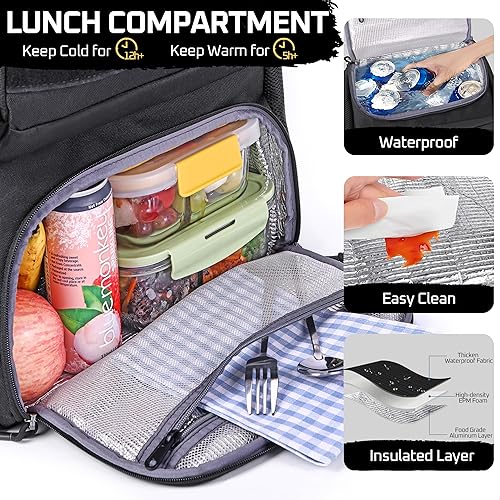 Insulated Cooler Compartment: Dimension of the lunch box compartment 12.59'' x 6.69'' x 7.48'' (hold up 10 cans). It is made of water-resistant Aluminum and high-quality lining material to not only keep the food warm but also keep drinks cold about 8-12 hours. Also the foldable lunch layer ensures food safety. Please note that when the lunch area is full, the available space for other things in the mens backpack will be correspondingly reduced.