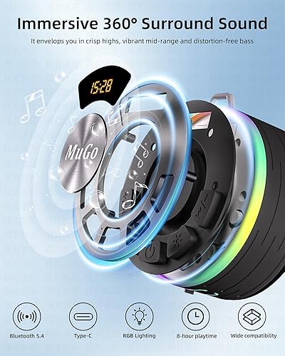 MuGo Bluetooth Shower Speaker, 360° HD Stereo Sound, IPX7 Waterproof Wireless Speaker Bluetooth 5.4 with RGB Lights, Suction Cup and Microphone, Small Shower Radio for Home/Party/Outdoor/Gifts