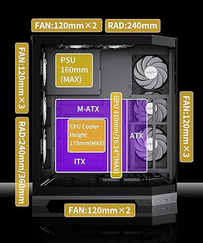 【Tower Case Powerful Space Layout】The internal structure of mid tower pc case is orderly divided by MUSETEX,each installation space is skillfully laid out,due to the powerful hardware compatibility,installation without blocks,players can enjoy the charm of gaming according to their favorite diverse DIY! Compatible with most mainstream hardware in the market,support GPU up to 410mm(16.14"),support CPU cooling height up to 178mm,support top mounting up to 240mm liquid RAD and rear mounting up to 360 liquid RAD,support PSU up to 160mm(6.3").