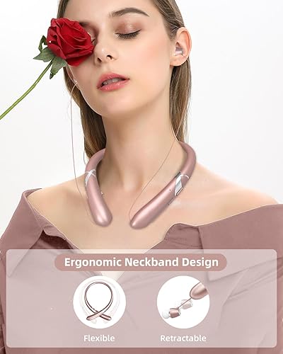 Neckband Bluetooth Headphones, Retractable Headphone with IPX5 Sweatproof & Call Vibration, Lightweight Comfort for Long Business Calls and Commuting(Rose)