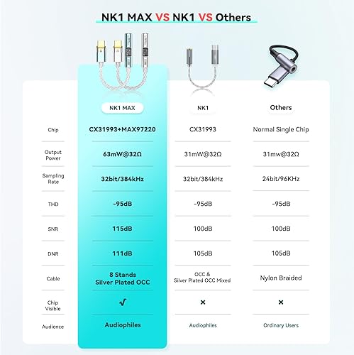 CX31993 + MAX97220 Dual Chips: This dac dongle features high performance CX31993 DAC decoding chip and MAX97220 OP-AMP IC. Support 32Bit/384kHz sampling rate, The MAX97220 provides powerful amplification for audio signals, ensuring low distortion and high SNR, providing an excellent dynamic range and distinct sound layers. Strong decoding power and clean, detailed sound with low distortion, accurately restoring details and delivering audiophile's pure hifi sound.