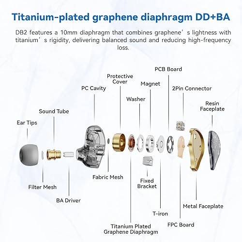 1DD+1BA Hybrid IEM:NiceHCK DB2 Wired Hifi IEMs features 1DD+1BA dual driver units. Hybrid dynamic and balanced armature drivers offer unparalleled sound, the acoustic adjustment makes the advantage of DD with 10mm graphene titanium coated diaphragm and BA to achieve balanced, the overall tone is loose, bass and midrange are solid, slightly diffuse low frequency brings an immersive ambient experience.