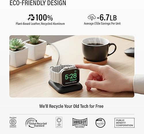 Sustainable Design: Made with certified recycled materials, this Apple watch stand charger helps cut 9.8 lbs of CO2 emissions. This watch charging dock ships in simple, plain packaging and includes a prepaid bag to recycle old tech devices.