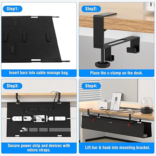 【Premium Quality Material】Under the desk cable management is made of high-quality 600D Oxford cloth can be flame retardant, with dustproof function, the bottom of the tray is supported to withstand heavy objects and keep the shape. Iron clips are reinforced with lifting strips to suspend greater weight. The support bar is designed with thickening, which is more sturdy and durable.