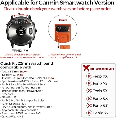 22mm TItanium Band Compatible Device:The 22mm band compatible with Tactix 8 47mm/ Descent G2/ Instinct 3 45mm Amoled / Instinct 3 45mm Solar /Instinct 3 45mm E/ Fenix 8 Amoled 47mm,Fenix 8 Solar 47mm,Fenix E 47mm,Fenix 5, Fenix 5 Plus, EPIX 2, Forerunner 935, Forerunner 945, Approach S60, Quatix 5, Quatix 5 Sapphire, Garmin Instinct, D2 Delta, Fenix 6, Fenix 6 Pro and Sapphire Editions, Fenix 7, Fenix 7 Solar, Fenix 7 Sapphire Solar