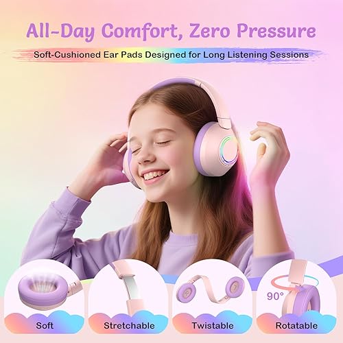 Colorful Flowing RGB Lights:Light up with dynamic, flowing RGB effects that pulse with your music. Whether your child is watching videos, playing games, or just relaxing, the soft glow creates an immersive, playful atmosphere they’ll love. A perfect balance of style and function—designed for kids and teens who want to stand out.