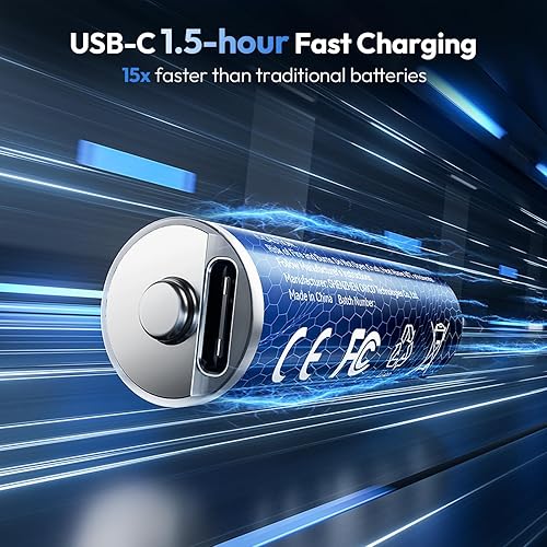 【 USB C 1.5 Hour Fast Charging 】With advanced lithium rechargeable technology, NTONPOWER rechargeable AA batteries fully charge in just 1.5 hours ( Use the 4-in-1 USB-C charging cable to charge four batteries simultaneously). This is 15x faster than conventional rechargeable batteries, saving time.
