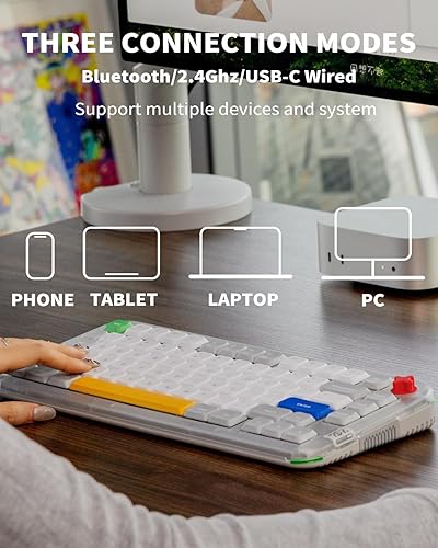 Seamless Connectivity Across Devices: Stay connected and productive with the Kick75's versatile tri-mode connectivity. Effortlessly switch between 2.4GHz wireless, Bluetooth 5.1, and USB-C wired connections, ensuring compatibility with a wide range of devices, including PCs, laptops, tablets, and smartphones.