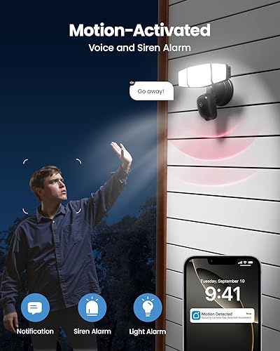 Alarm Light & 105dB Siren: Scare off intruders or animals with a flashing flood light with camera and loud siren (manual or auto-triggered via app). Note: Consider neighbors when enabling auto-alarms.