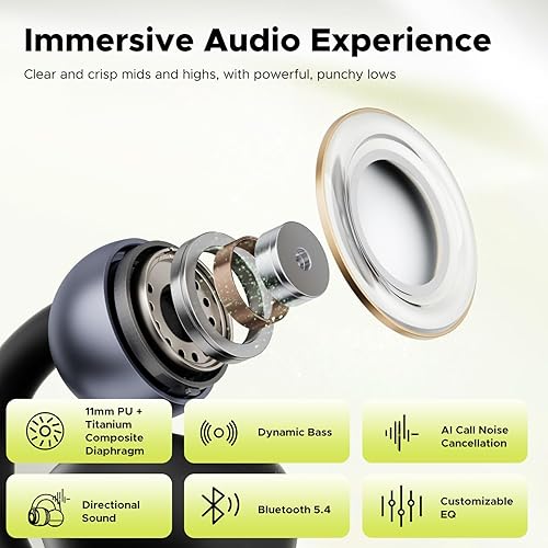 【11mm Titanium Drivers with Dynamic Bass Boost】Immerse in deep, resonant bass and crystal-clear highs powered by 11mm large drivers featuring PU + titanium composite diaphragms. Proprietary 360° spatial audio creates cinema-like immersion, while directional sound transmission minimizes leakage. These high-performance earphones are perfect for EDM, podcasts, or high-intensity training — delivering rich, consistent sound at any volume.