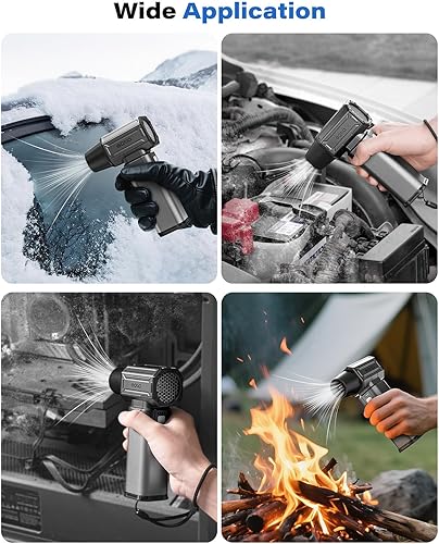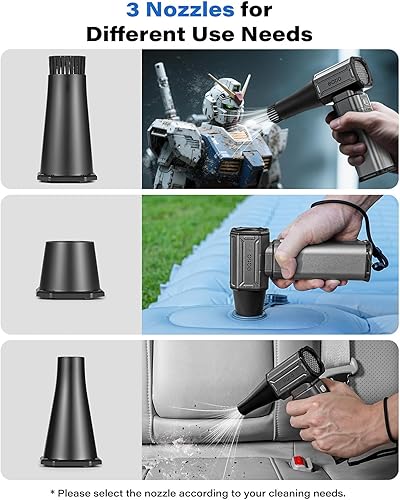 Multi-Use Versatility: Equipped with 3 nozzles and 1 brush, this compressed air duster is perfect for cleaning PCs, keyboards, home and outdoor use. As well as efficiently blowing away leaves water spots on car. The electric air duster is also ideal for managing campfires when camping