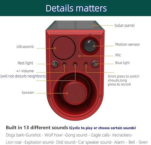 [Upgraded version] 1)Worry the animas get used to single sound? Now it gets 13 sounds,2)Support recording,3)Support +/-Volume,no worries from bothering your neighbors any more,4)Red&blue warning light instead of red light