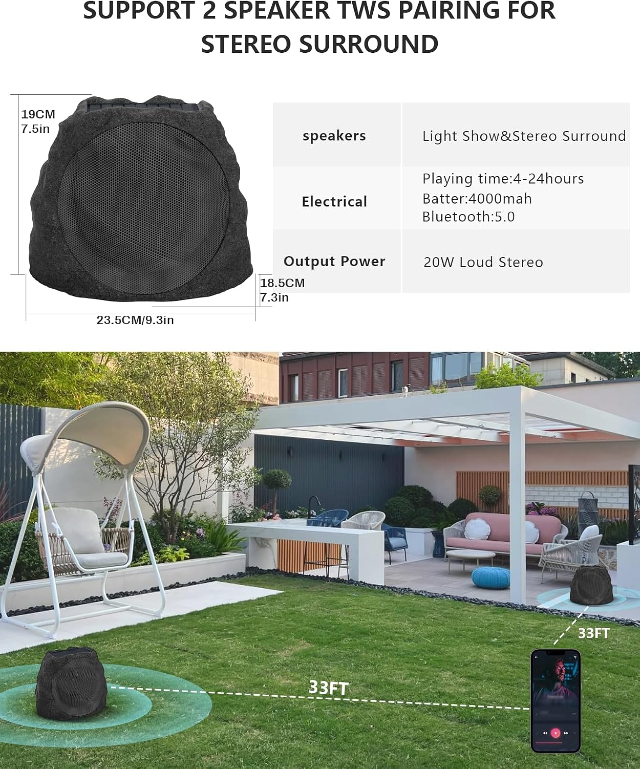 LONG-LASTING PLAYTIME & EXTENDED BLUETOOTH CONNECTIVITY: Outdoor rock speaker playtime with up to38hours only light on,playtime up 4-8 hours(80% Vol and light on) ,per charge and extended wireless range with Bluetooth 5.3, reaching up to 33 feet from your device. Keep in mind that the actual playtime can vary depending on volume level, audio content, and usage