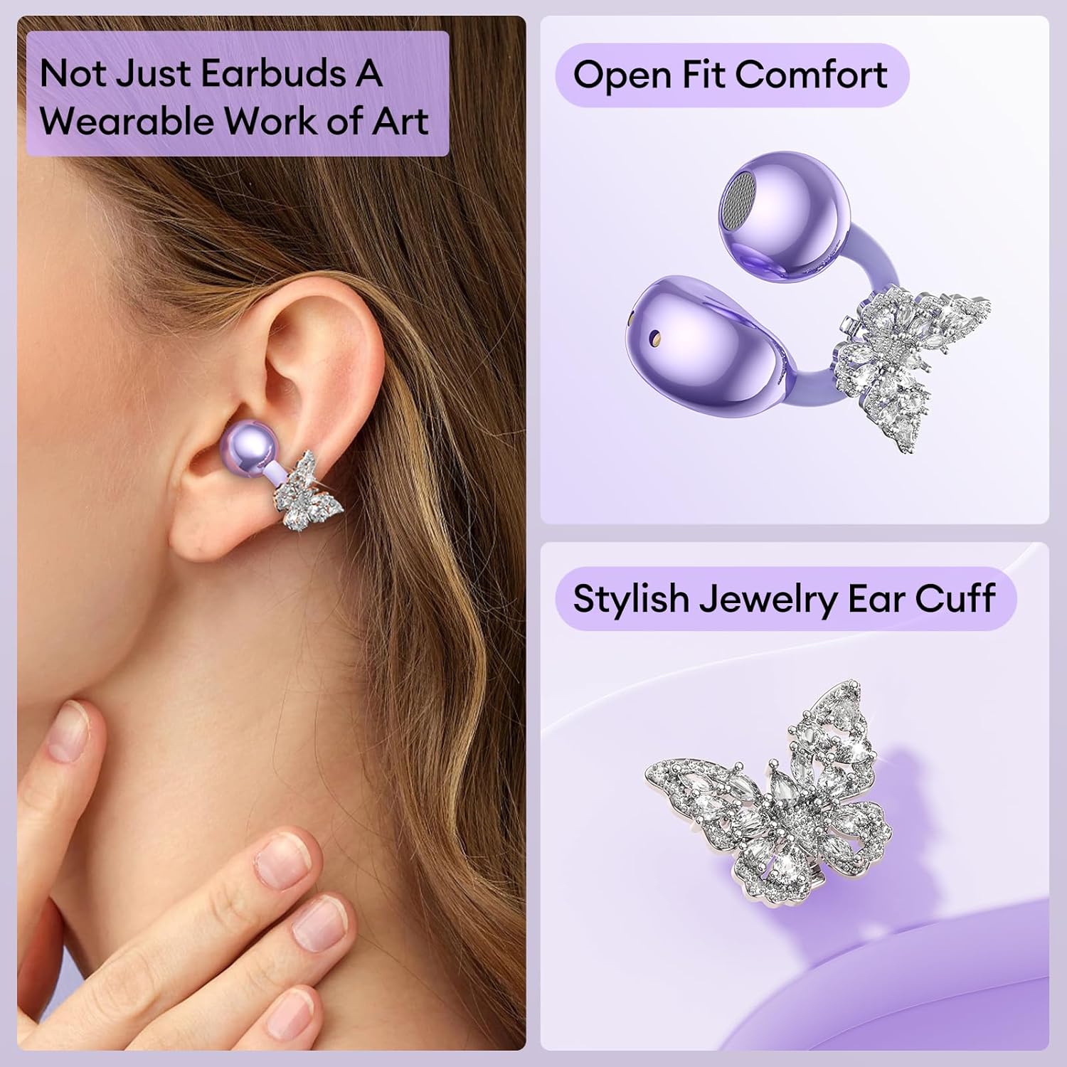 Jewelry-Inspired Elegance Designed to Sparkle: Not just wireless earbuds - a chic fashion accessory. Featuring a removable butterfly earcuff with customizable designs, these open ear earbuds combine avant-garde style with crystal-clear sound. Wear them as a bold statement or a subtle accent-perfect to match your outfit or mood