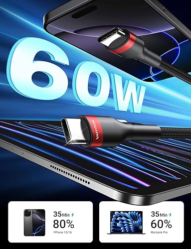 【PD 60W Fast Charging & 480Mbps Data Transfer】This short USB C cable lets you experience fast charging and high speed transfer. USB 2.0/480Mbps transfer rate is 20 times faster than most WiFi, and with its unique heat dissipation and PD 60W technology, The Type C to Type C Cable can charge your 1Phone16/15 series or Samsung Galaxy series up to 80% in 35 minutes; it can charge your 1Pad Pro/Air series up to 65% in 35 minutes; it can charge your Ma-Book Pro/Air series up to 60% in 35 minutes.
